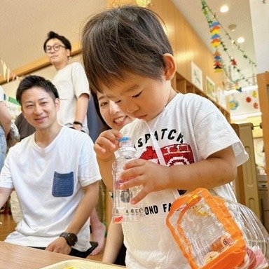 真剣なお顔でペットボトルにぽとんぽとん。お父さんお母さんに優しく見守られてがんばったね!