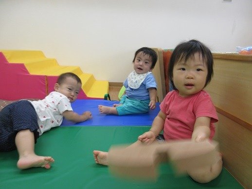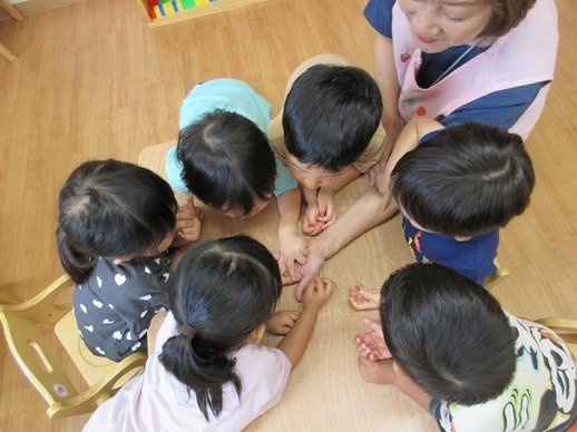 くっついた!子ども達は大喜び。先生も大喜び。おててをぐーんと伸ばして指さす姿がかわいらしいですね。