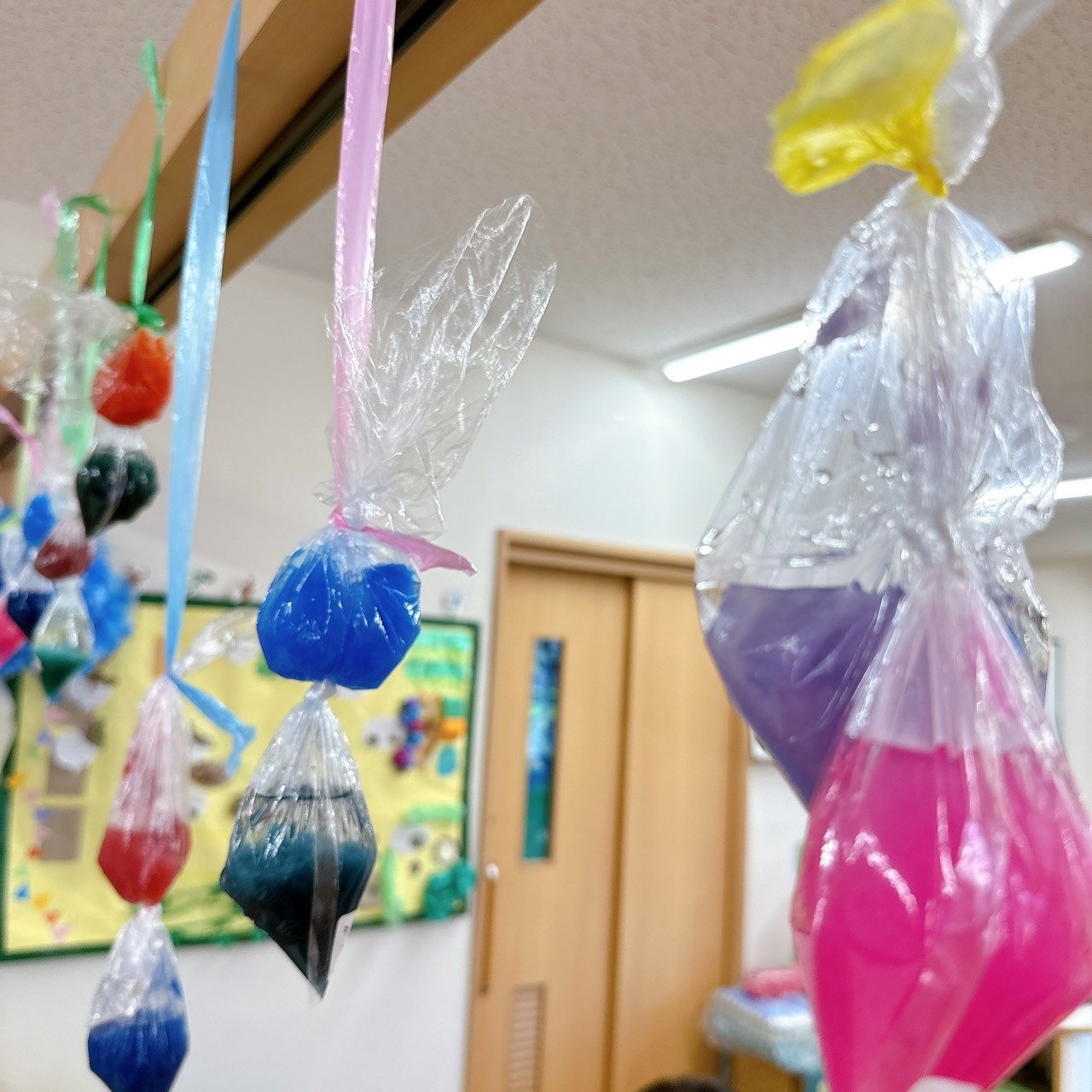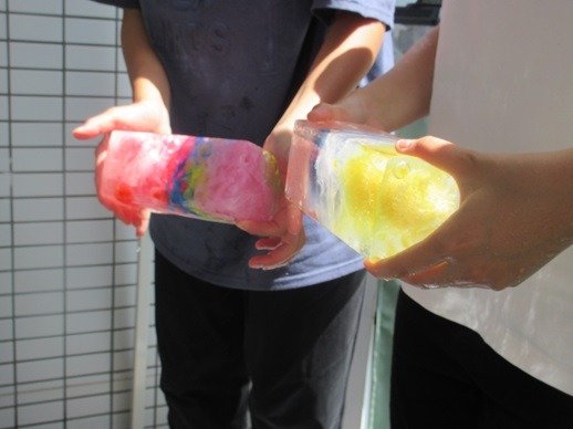 おもちゃや、色水で作った氷柱。つめたくって気持ちいい!