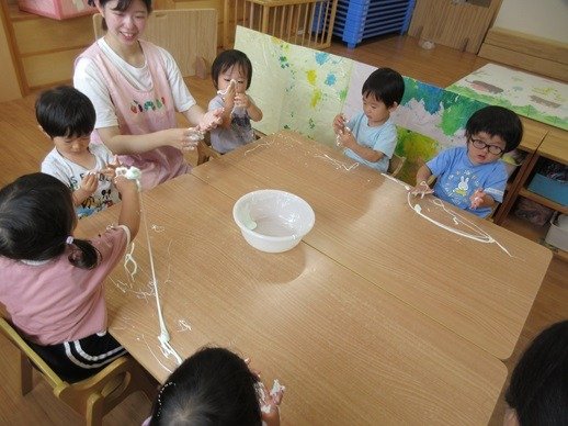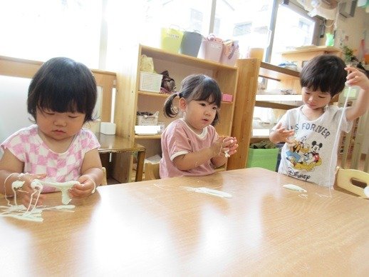 びろ~んと伸びた小麦粉粘土。柔らかくて手にとろとろ~んとくっつく触感が気持ちよくて、伸ばしたり丸めたりちぎってみたりと、それぞれの楽しみ方で遊びました。