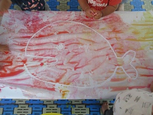 大きな紙にお絵描きをしたら、それを持って水遊びへGO!