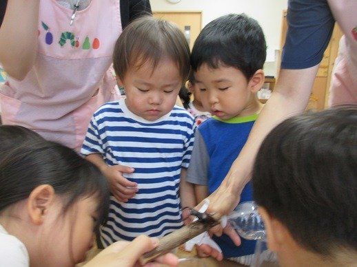 ケースの蓋を開けると、「角がかっこいい」「足が動いてる」と、今日も観察が始まります。。すると、図鑑を持ってきて「これ、おんなじや!」どれどれ・・・と、みんなで図鑑のカブトムシと見比べっこ。幼虫からお世話しているので愛情たっぷりです。