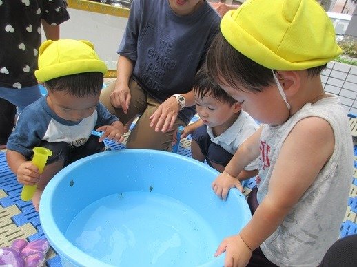 水遊びをしながら、カエルさんを泳がせてみました。子ども達の「スーイスーイ」という声に合わせるかのようにカエルさんは足を伸ばしてスーイスーイ。