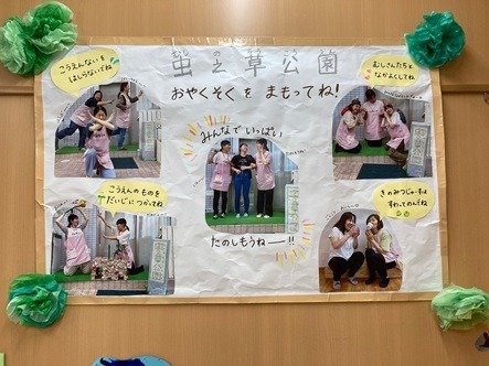 公園の注意もちゃんと読んでね。虫の草公園は虫の仲間がいっぱいいるから走ると危険。虫と仲良く、みんなで楽しもうね!