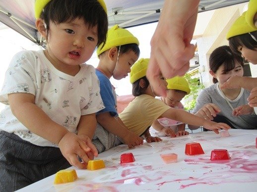 おもちゃのスプーンや包丁を使って、すきな色の寒天をカップに入れました。青も黄緑も黄色も透き通る色で涼しげです。