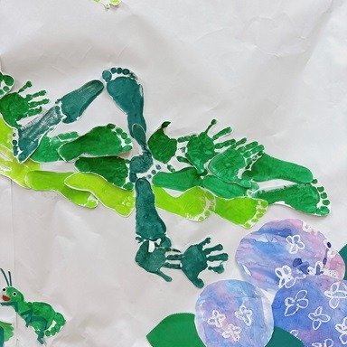 子ども達の手型足型で作った巨大〇〇〇〇。それから優しい色の紫陽花。