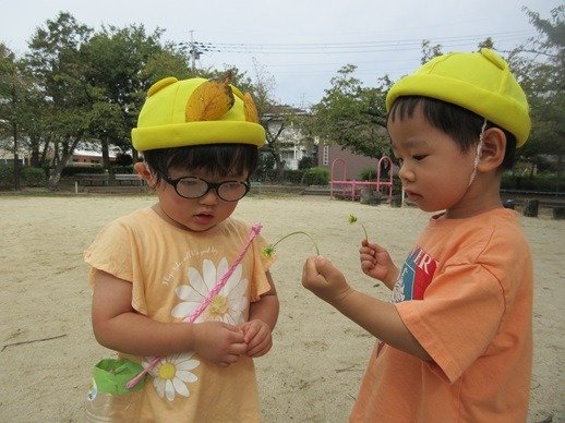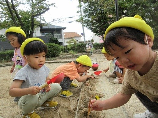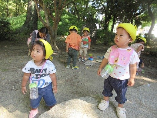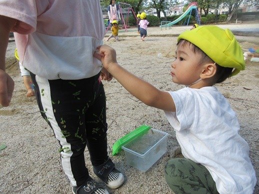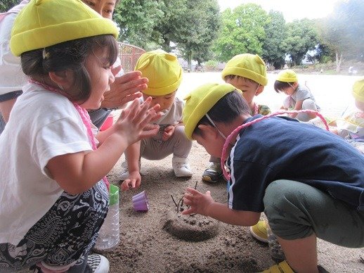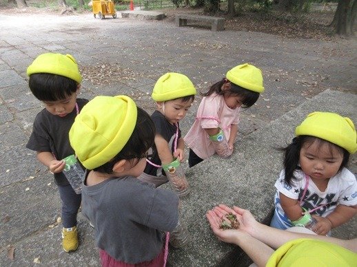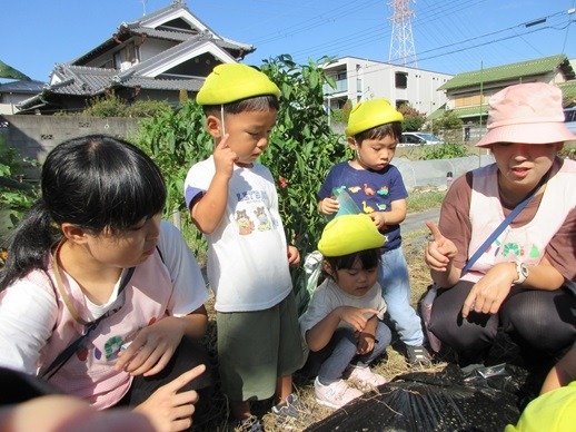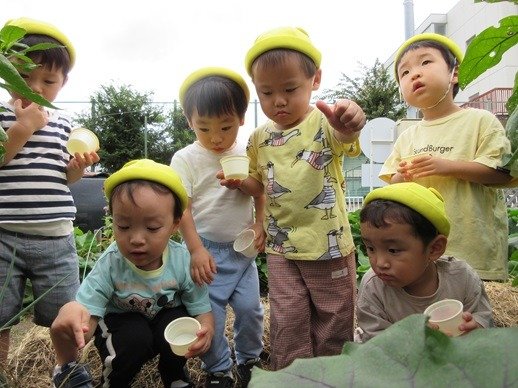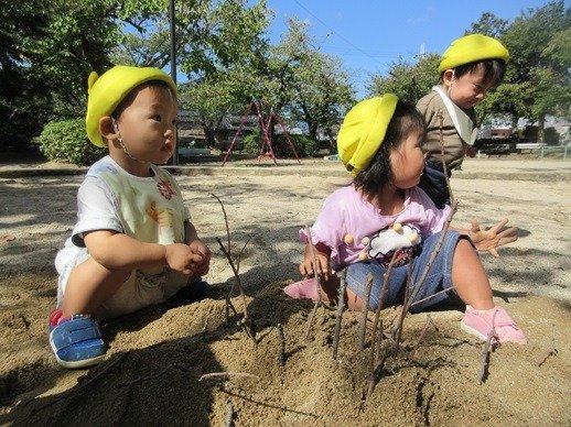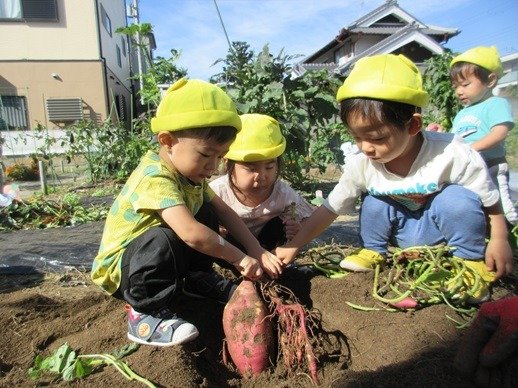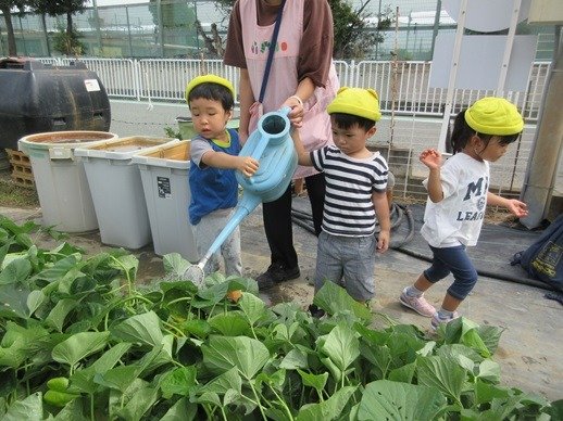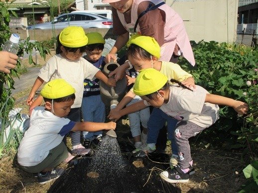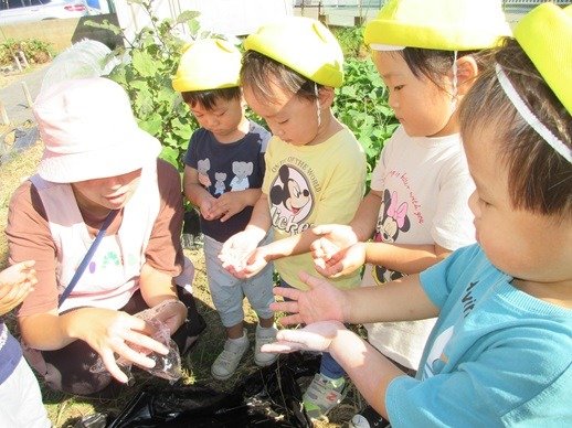 10月はさつまいもほりをします。くま組さんが畑にいって水やりをしてきてくれました。バッタがいっぱいでね、両手を使って上手に捕まえていますよ。野菜よりバッタかもしれませんね。笑