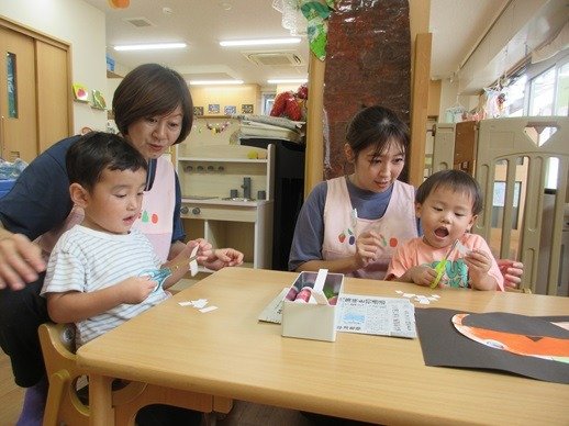 ハサミにも挑戦しましたよ。細長い紙をチョキン!チョキン!と切っていくうちに楽しくなっちゃった。緊張していたお顔も笑顔になりました。