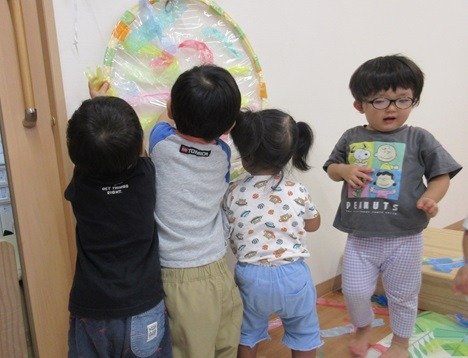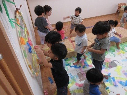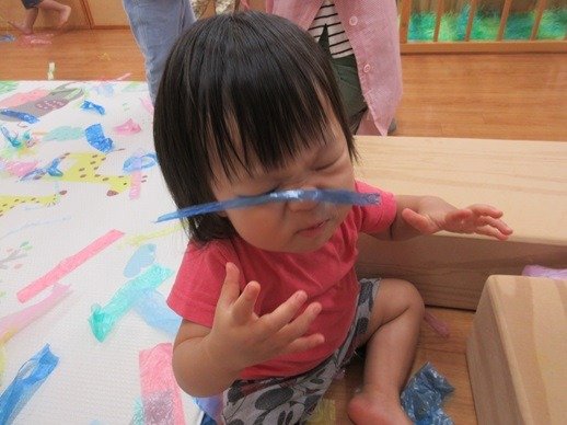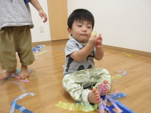 小さく切ったスズランテープで遊びましたよ。なにげなくかけてあった壁のフープは、透明テープが貼ってあり、そこにペタペタくっつけられる仕組み。あえて子どもたちには言わずに様子を見ていたら、気が付いたお友だちがいました。先生も「やった!」とガッツポーズです。