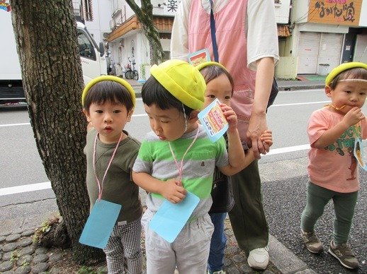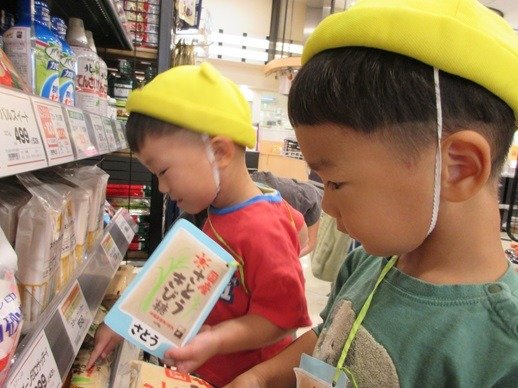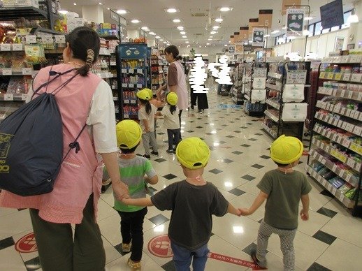 この日はうっかりお買い物をし忘れた先生に頼まれて、スーパーまでおつかいにいきました。初めてのおつかいです。「お願いできる?」と先生。「はーい!できる!!」とやる気満々のこどもたち。