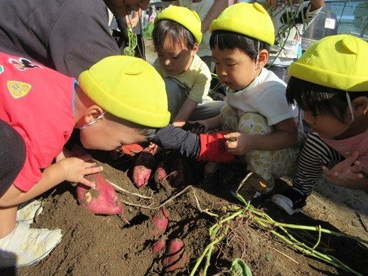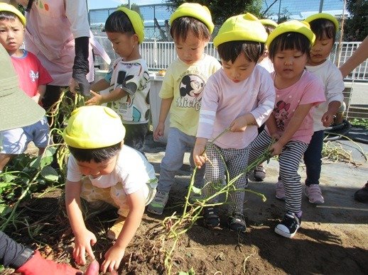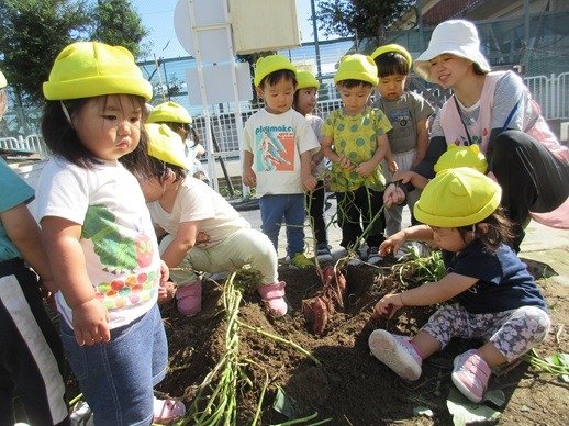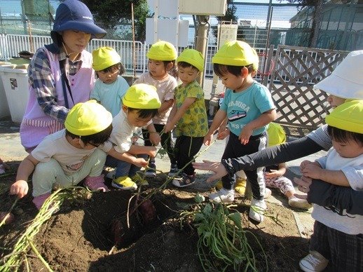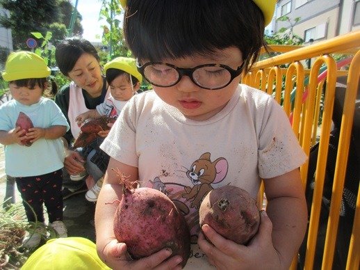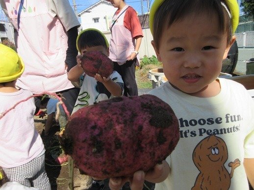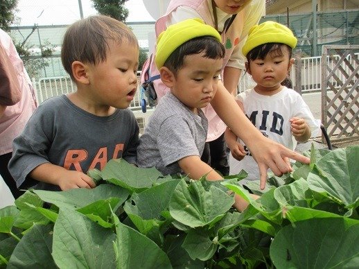 出発前に読んでもらった絵本のようなお芋が出てくるのかな?とっても楽しみで畑に到着。土から少し頭を出しているお芋を見つけて「あった!ここにおるよ!」と指でツンツン。