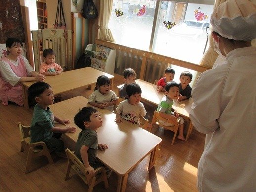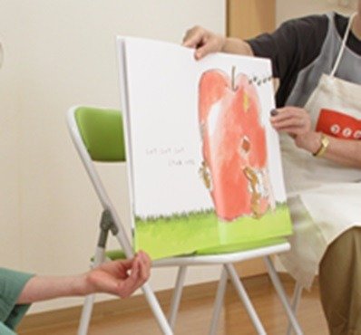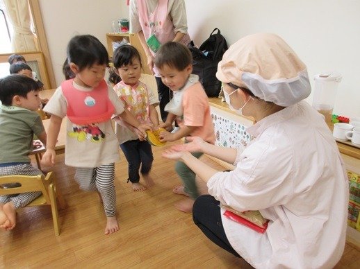午前中のお楽しみは、おはなしひろばから読み聞かせに来てくださいました。くだもののお話や色のお話、楽しい歌も交えて子どもたちの興味をググっと掴んでくださって