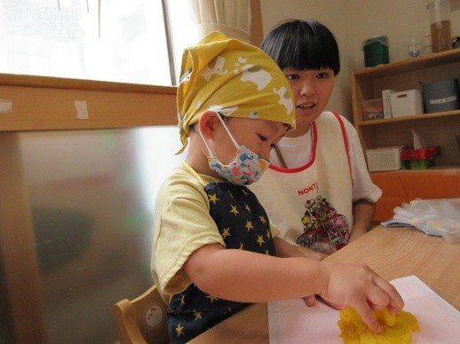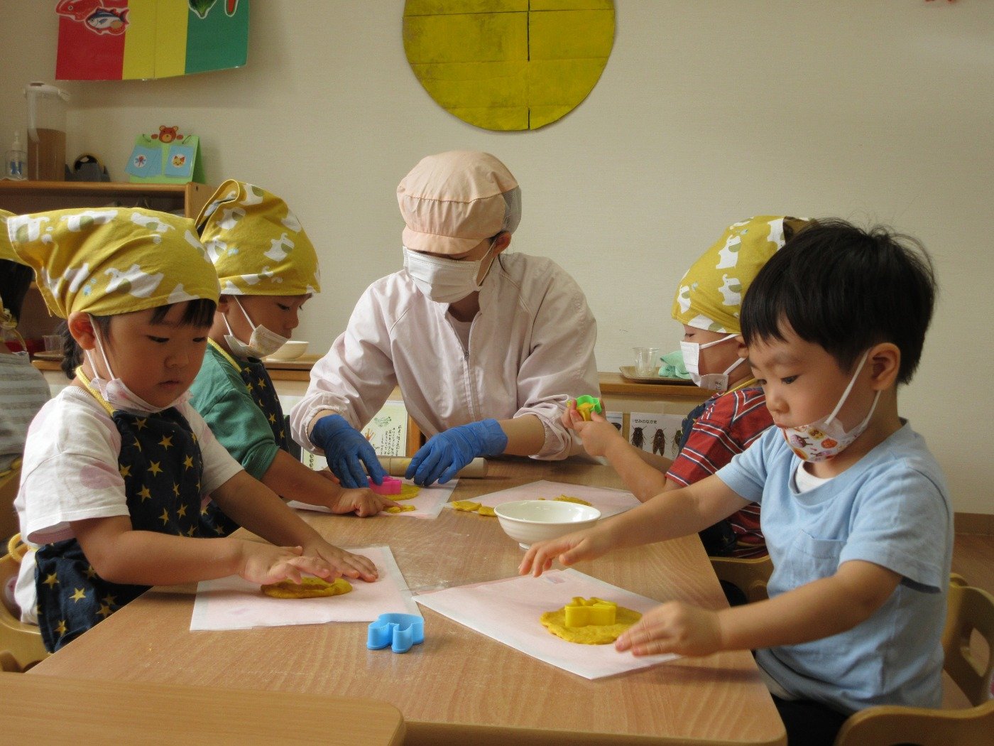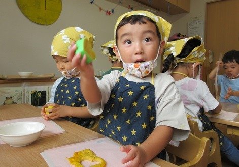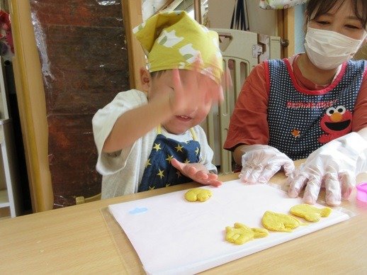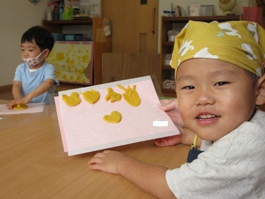 お昼寝から起きると、お部屋は焼きたてクッキーの良い香りでいっぱい。自分で作ったクッキーのお味はいかがかな?かぼちゃの甘味で優しい味のクッキー作り。大成功でした!