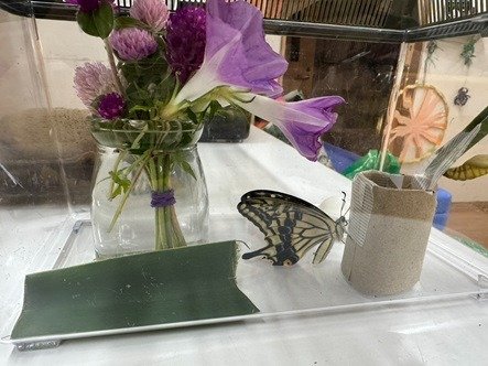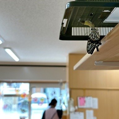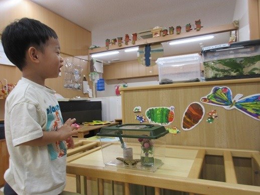 月曜日の朝。蛹がきれいなアゲハ蝶に変身していて、壁に貼っておいた”はらぺこあおむし”と見比べて「いっしょ!」「いっしょ!」と子どもたちも嬉しそう。