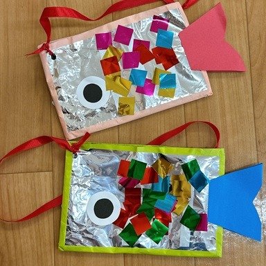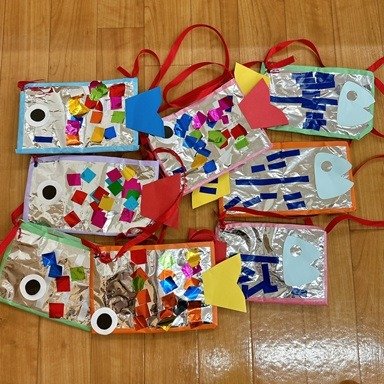 ピカピカのおさかなかばんは、ハロウィンのお菓子を入れるためのかばんです。スナック菓子の袋を使って作ったんですよ。