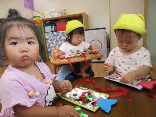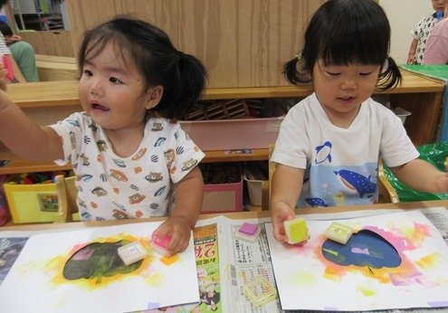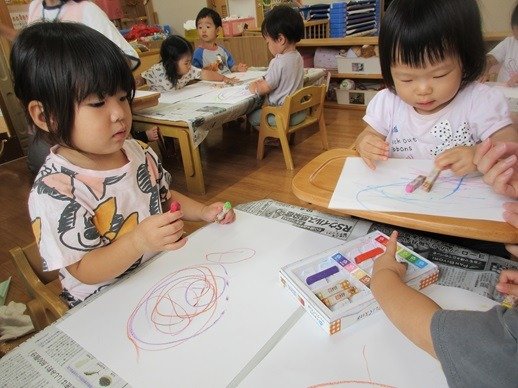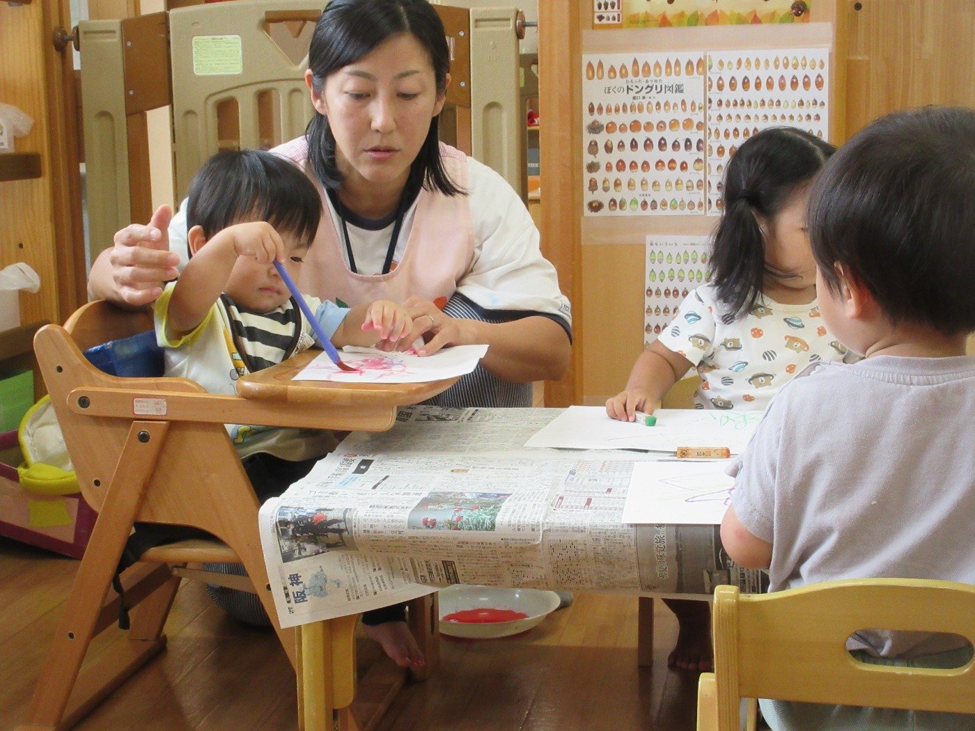 ほしさん達ははじき絵にチャレンジ。絵の具の色は三色。「赤にするお友だち、こっちね」それぞれ好きな色の席に分かれました。自分の好きな色が分かっている様子だったり、クレパスを”描くもの”と認識してた姿など、成長を感じた製作でした。