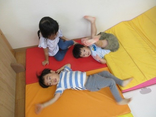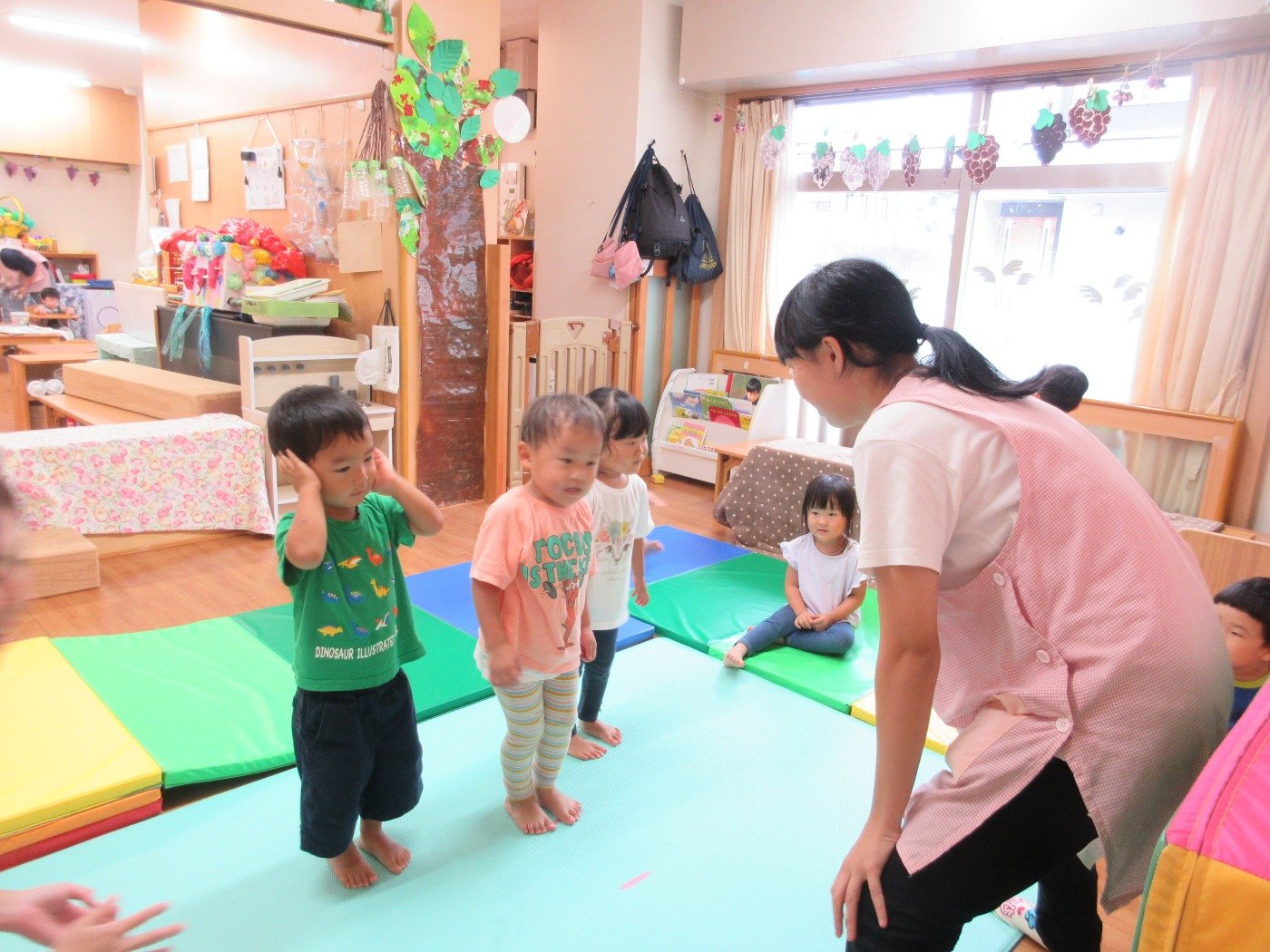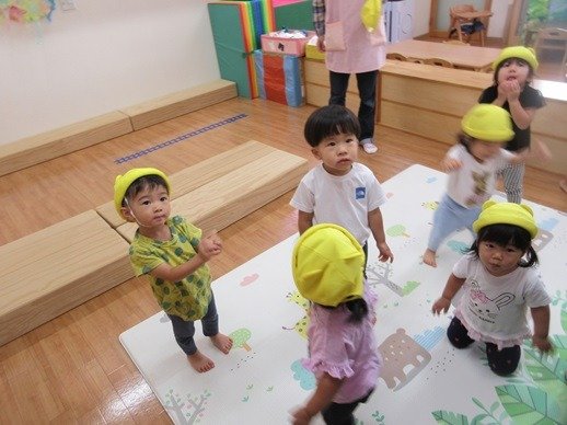 雨の日はマット遊びや製作をして過ごしました。今月の体操は♪かぼちゃチャチャ。ハロウィンのかわいい体操です。それから♪かわいいさくらんぼ。どちらも子どもたちの動きがかわいいだけではなく、フレーズが頭に残るんです。ついつい♪か~ぼちゃ ちゃちゃちゃ いぇ~い♪ ♪チェリービーム♪と口ずさんでしまうんですよ。