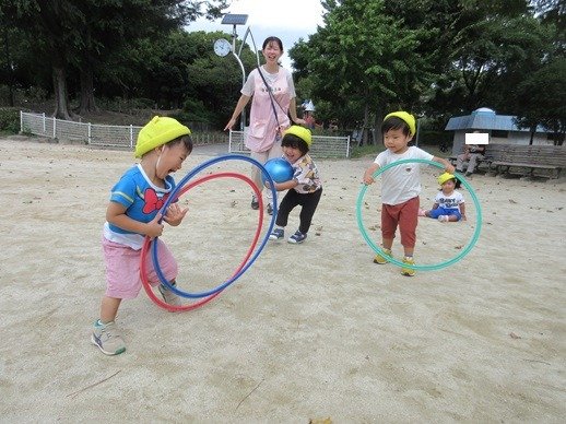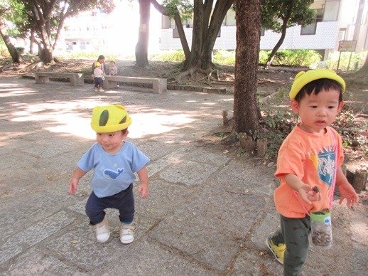 公園に行くと、とことこ とことこ 散策をしては、木の実や小石をままごとのおもちゃに集めて遊んでいます。フープで電車ごっこ、追いかけっこ、ボールに、大きな石の上に登ったりと元気いっぱいです。