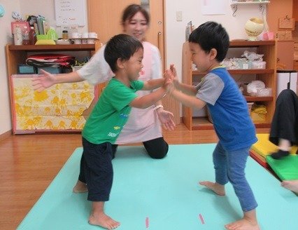 おすもうをした後は「ふぅ~。暑いわ~!!」とみんな汗だく。先生との対決では、お友だちと力を合わせてがんばりました。しっかり踏ん張っていないと先生も倒されてしまうほど力が強くてビックリします。
