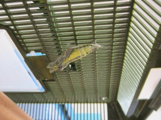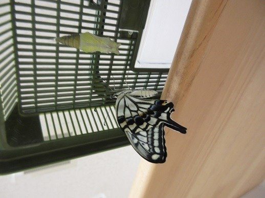 アゲハ蝶です。4匹目ともなると蛹の色で羽化するタイミングが分かるようになり、棚の上に置いて楽しみにしていました。