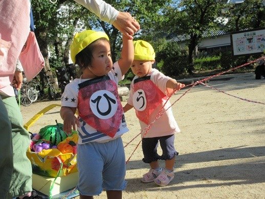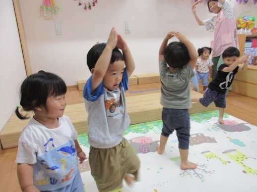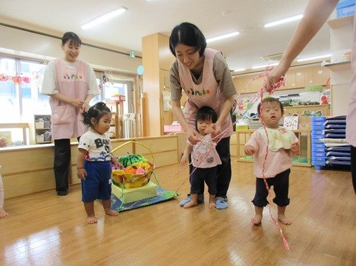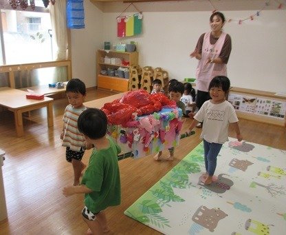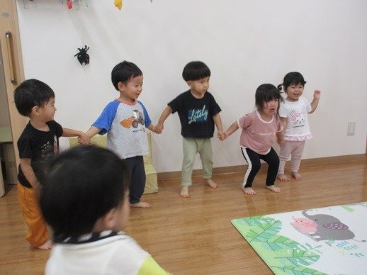 おみこしのあとは♪つきよのポンチャラリン♪をみんなで踊りました。恥ずかしそうにしているお友だちも、はりきって踊っているお友だちも、ぶらんこゆらゆらのお友だちも みーんなかわいかったよ!