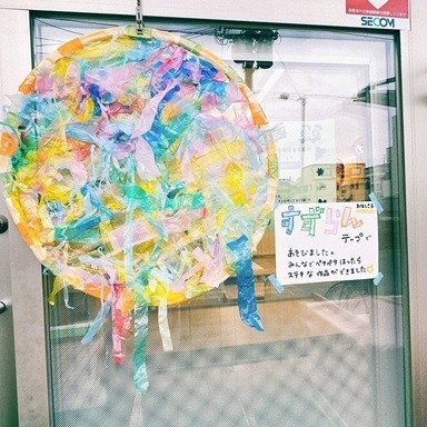 子どもたちが貼って遊んでいたフープはこんなかわいらしいものになりましたよ。