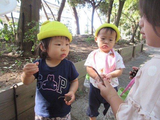 子どもたちが集めてくるのは、どんぐりだけではありませんよ。木の枝やふうの実、まつぼっくり、引っこ抜いた草なんてこともあります。どれも大事な宝物なので、お散歩バッグに詰め込んで帰ってきます。あまりにも重そうな時は、どれを残すか考えたりすることも。