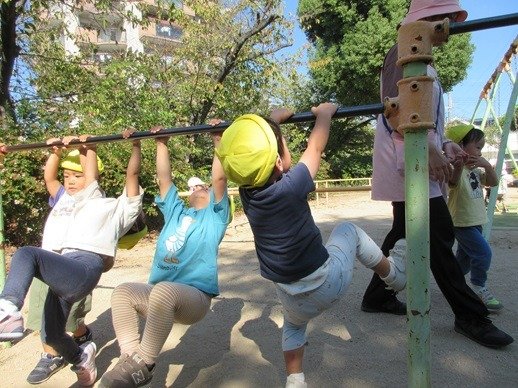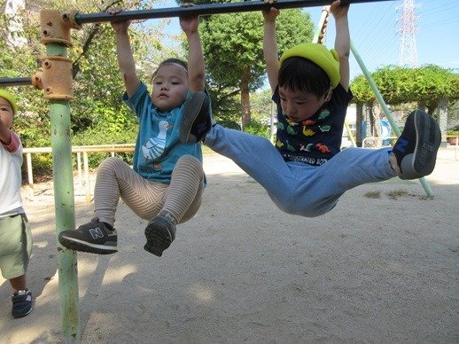 鉄棒にぶら下がって「こんなことできる~?」腕の力もこのとおり!体を動かして遊ぶのが大好きです。