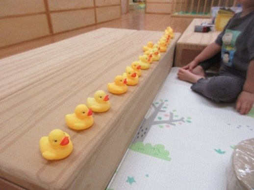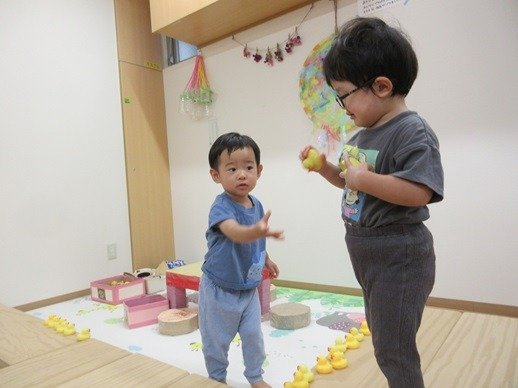 お鼻にあひるをギュッとしたお友だちをみて真似っこして大笑い。「なんてかわいいの♡」