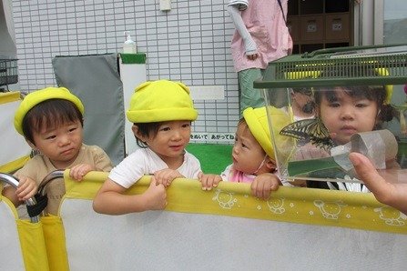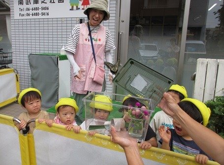「うわ~♡とんだね!」嬉しくってたまらない子どもたち。一緒に外に逃がしてあげました。「ばいばーい。元気でね」ひらひらととんでいくアゲハ蝶の姿が見えなくなるまで、みんなで手を振りました。