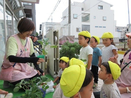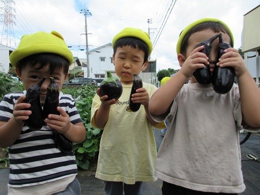 「みて~」今日もたくさんナスがとれました。給食のお味噌汁に入れて食べたり、焼きナスを作ったりと、保育園でもいっぱい食べたので、この日はお土産に持って帰りました。ピーマンが辛かったんじゃないかな。大丈夫だったかな。