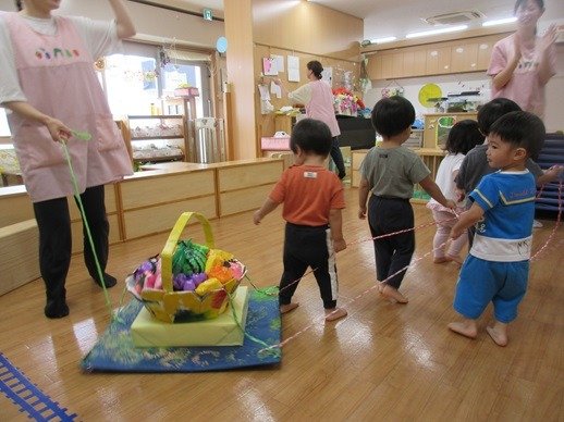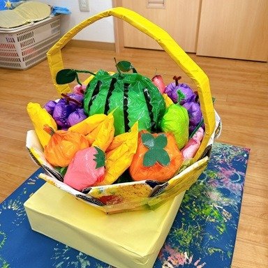 ひよこ・うさぎ組さんのはフルーツがいっぱい。先週ティッシュで遊んで何になるかな?って話していたものは果物になりました!それに、この籠は、ふふふ・・・そうです、満月だったもの。かわいい籠になりましたよ。