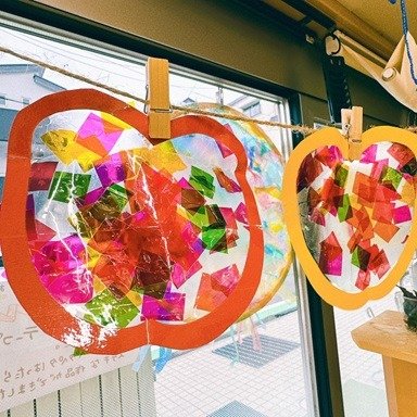 窓に飾ったステンドグラスの製作に秋の日差しが差し込んで、床にほんのりと赤いリンゴがうつしだされたのを、子どもたちと喜んで見ています。10月のお楽しみ。お父さんお母さんも一緒に楽しみましょうね!