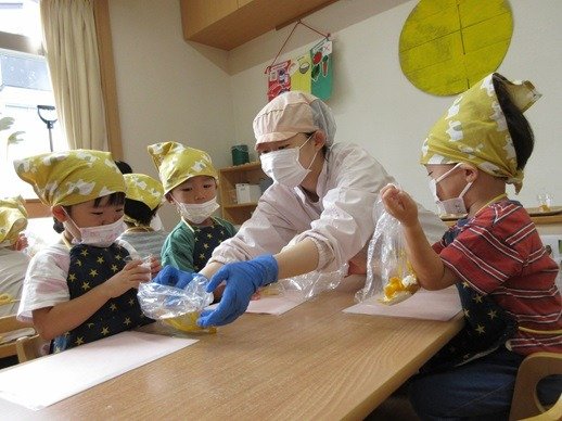 袋に粉とカボチャと・・・材料を入れたらモミモミ。なかなかうまくまとめられなくて、ちょっと苦戦したけどがんばったね。