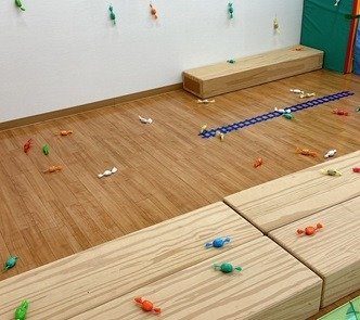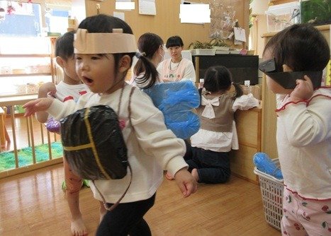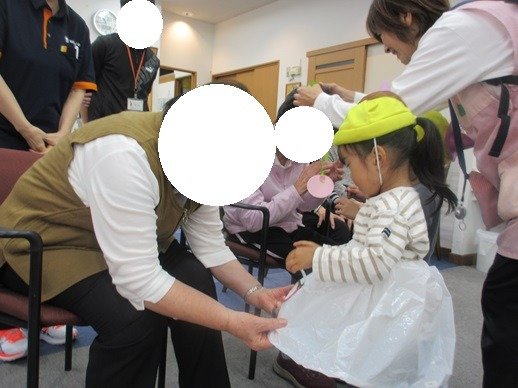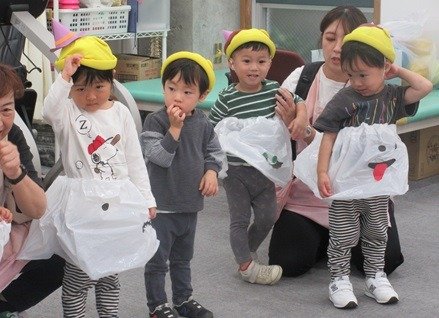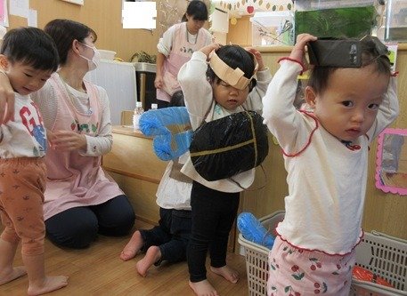 地震がきて波おばけの津波がきたら、保育園にいては危険なことを、イラストを使って子どもたちに分かりやすく話をし、マンションの上まで避難しました。「うんうん」とうなづきながら、真剣にお話を聞いていたお友だちが、「車も食べちゃうん?」と後で聞いてくれました。災害について知る機会になったようです。