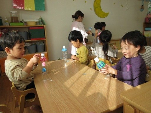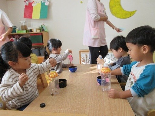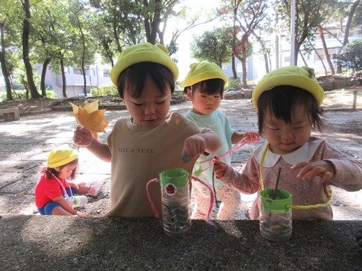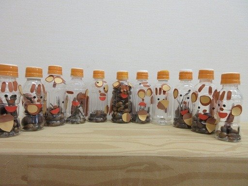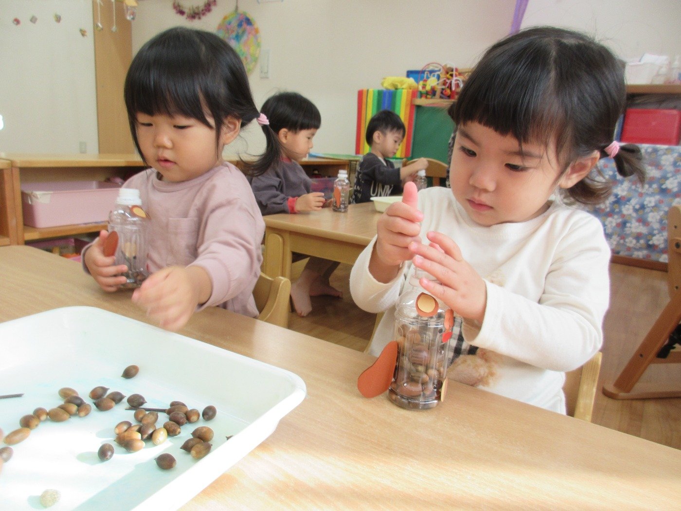 ペットボトルのリスさんにどんぐりをポットンポットン♪入れたり出したりと遊びながら楽しんで作ったので、みんなが完成する頃には、どんぐりがペットボトルいっぱいのお友だちもいれば、一粒しか入っていない子も。それもその子らしさがでて素敵だなと思っています。
