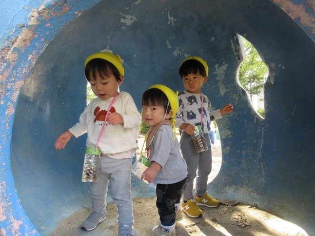 この公園に行くと子どもたちが必ず中に入る遊具。ほどよい広さがあって、よく寝転がったりしているところです。「ばぁ」「みーつけた」と穴から覗くと「きゃー!!」と大騒ぎでみんな逃げていきます。その時の表情もイキイキしていてかわいいですよ。