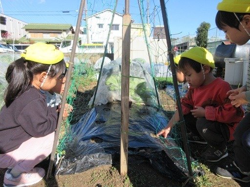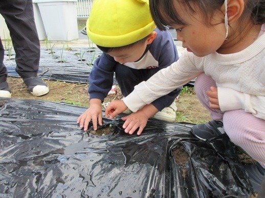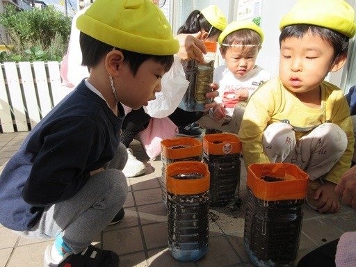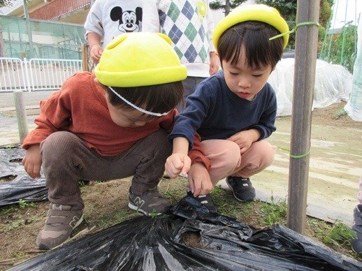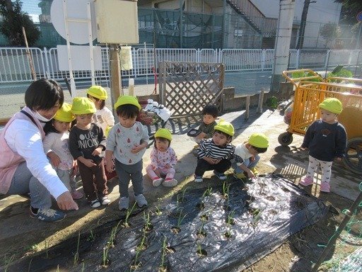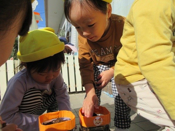 それから、くま組さんは先日お買い物したチューリップの球根を植えました。土をかぶせて球根がかくれんぼ。お水やりをよろしくね。春になって花が咲くのが楽しみです。
