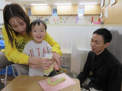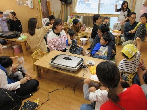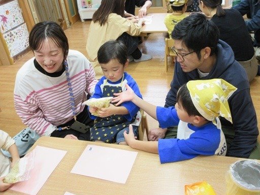 栄養士から子どものおやつについてや、くま組さんの人気のおやつ、クッキング、三色食品群についてもお話をして、保育園での食育を知ってもらう機会にしました。