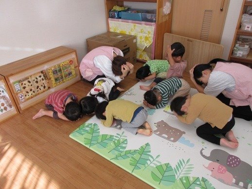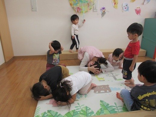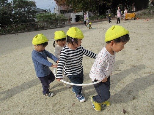 11月5日は緊急地震速報の訓練がありましたね。大きな音に驚きました。保育園でも地震と津波の避難訓練をして”だんごむしのポーズ”の練習をしましたよ。頭を隠してまぁるくなるよ。