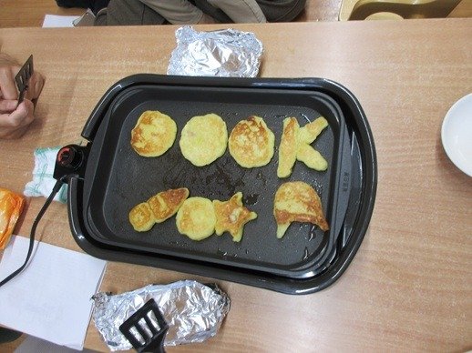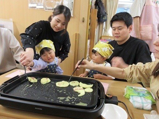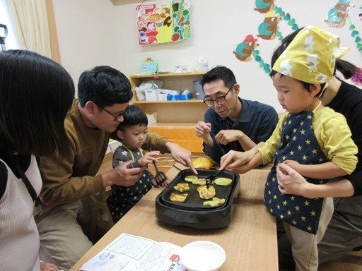 どのテーブルもホームパーティーみたいに楽しそう。バターをとかして、そっとさつまいももちを置いたら、部屋中おいしそうな香りでいっぱいになりました。ホットプレートで火傷しないかと心配でしたが、お父さんお母さんのサポートが素晴らしく安心してお任せすることができました。