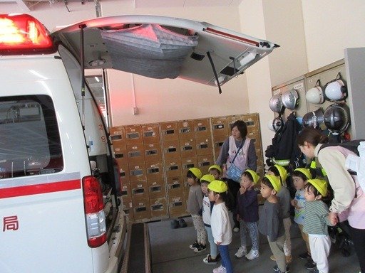 見学をしていると、緊急要請の大きな音がなり、みんなビックリ。安全な場所に移動して、消防士さん達が準備をして、素早く消防車と救急車に乗り込み、出ていくのを「がんばって!!」と手を振って見送りました。