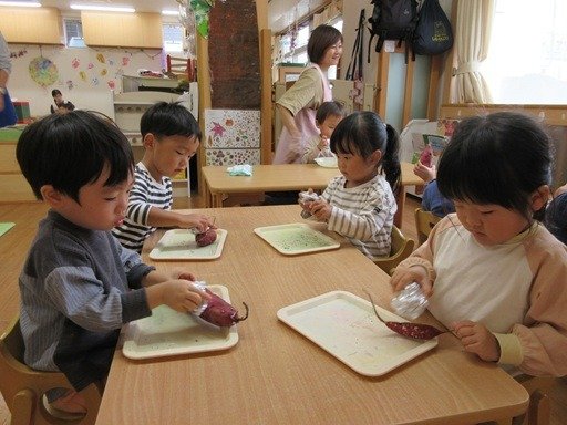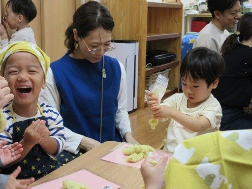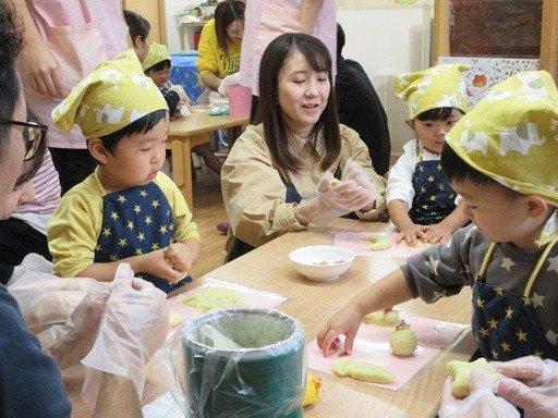 お芋ほりをしたのは10月のこと。そのお芋を使って、くま組さんが親子クッキングを行いました。