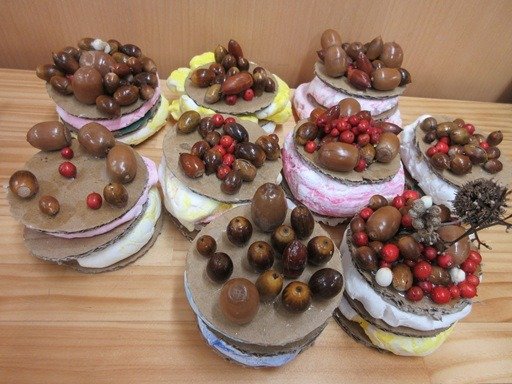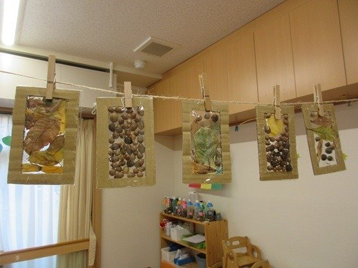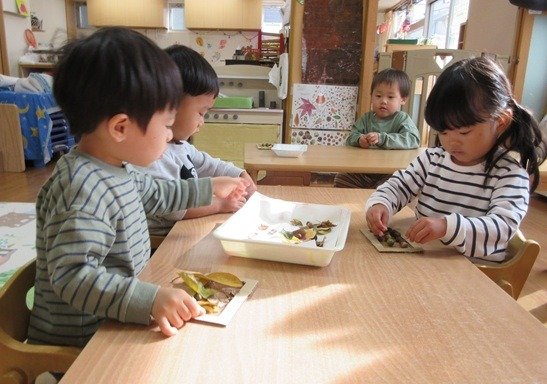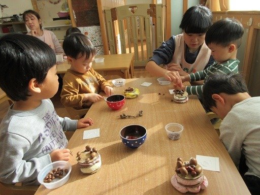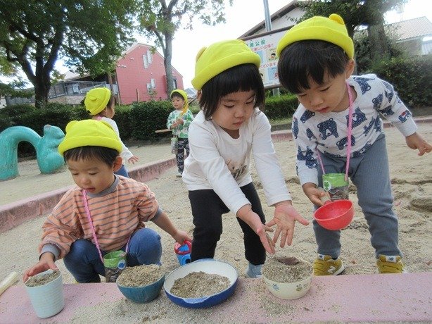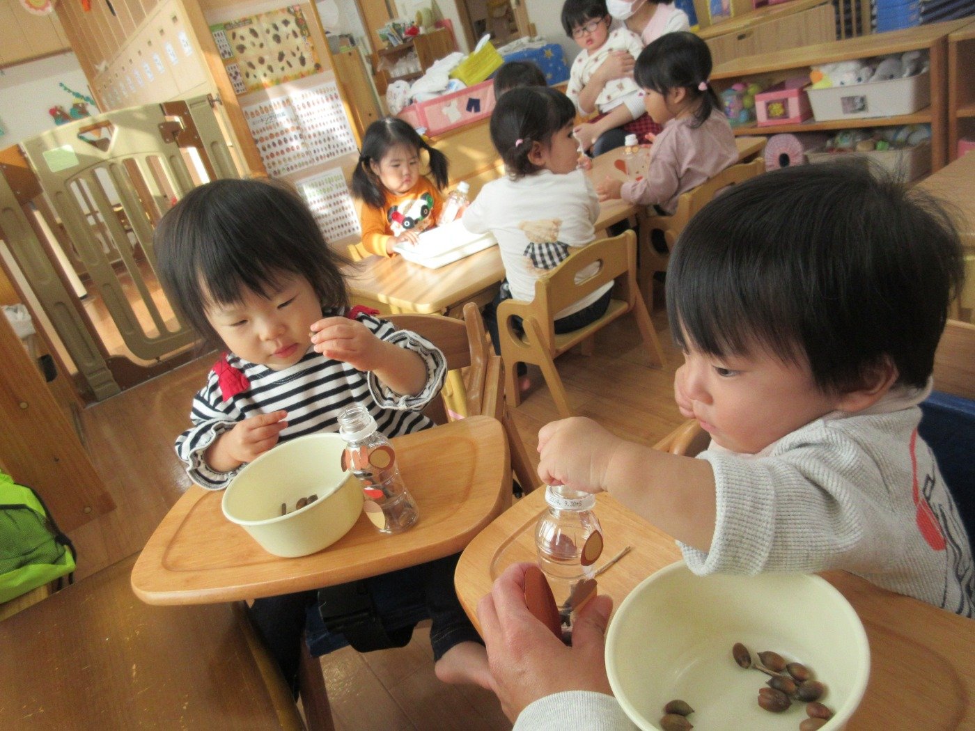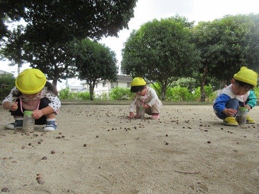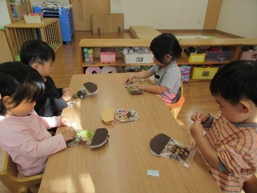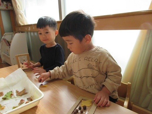 拾ってきたどんぐりのお家を作っています。自分で拾ってきた大切などんぐりですからね、丁寧にポトンポトンと入れて、たくさん集めるのを楽しみにしています。(注:拾ってきたどんぐりは湯がいてしっかり乾かしてます。)