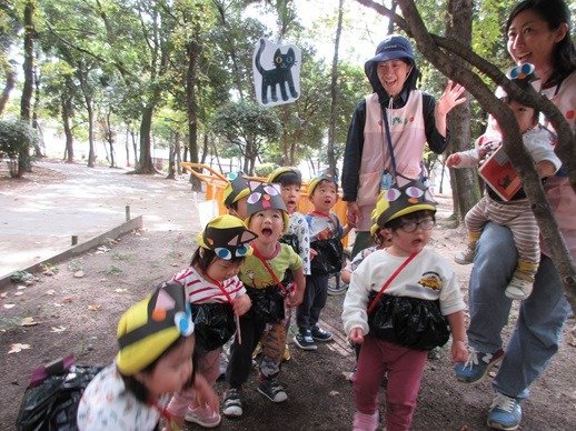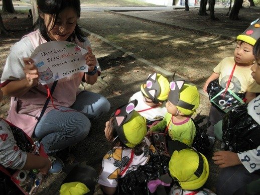 「さぁ、ねこちゃんたち、公園に出発しよう!」と先生。