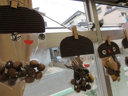 風にゆらゆらゆれる”みのむし”ができました。♪山の音楽家の歌絵本にみのむしがでてきて「いっしょ!」と、みのむしにピン!ときたようです。今度、公園でみのむしを探してみようね。