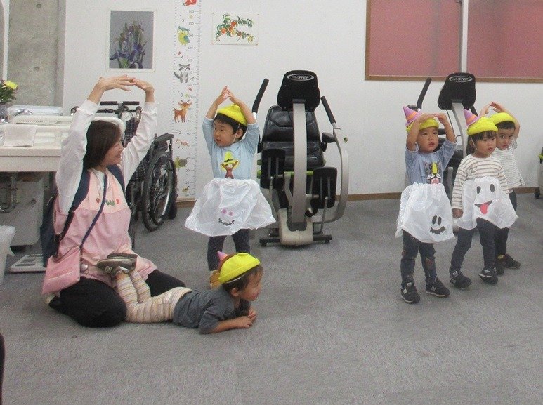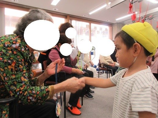 初めてディサービスに訪問しました。ちょっと緊張していた子どもたちも、優しい利用者さんの笑顔で、自信を持って大きな声で自己紹介ができました。「お名前は?」と聞かれ、好きな遊びを答えてくれたお友だちや、変顔を見せて和ませてくれたり、どんぐりころころや、おいもの歌は振り付けつきでうたう子どもたちに大人たちはみんな心を奪われてしました。