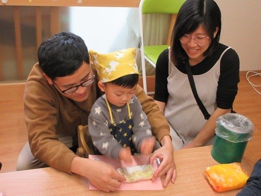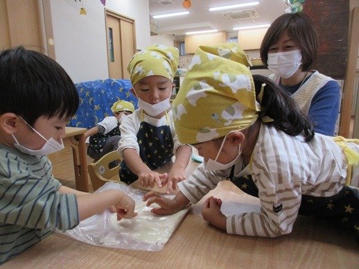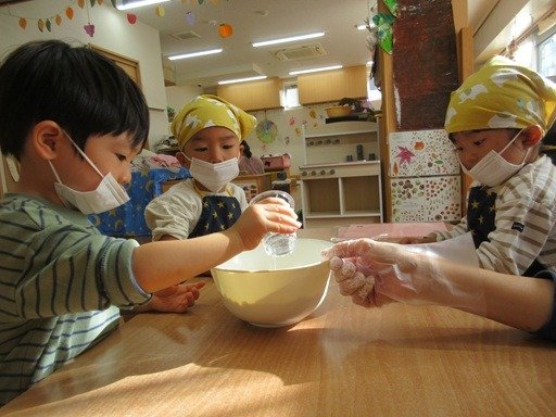 きれいに手を洗ったらいそいで座り、始まるのがまちどおしそう。粉や水は自分たちで入れました。そーっとそーっと。