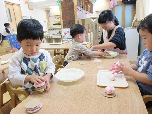 くま組さんは紙粘土に絵の具のバナナ味(黄色)や、イチゴ味(赤色)をつけてもみもみ。しっかりまぜこんだら丸く切った段ボールで挟んで、ミルフィーユケーキの土台ができました。