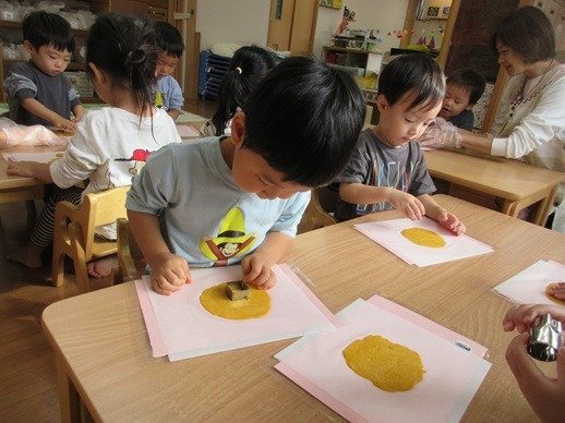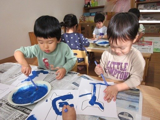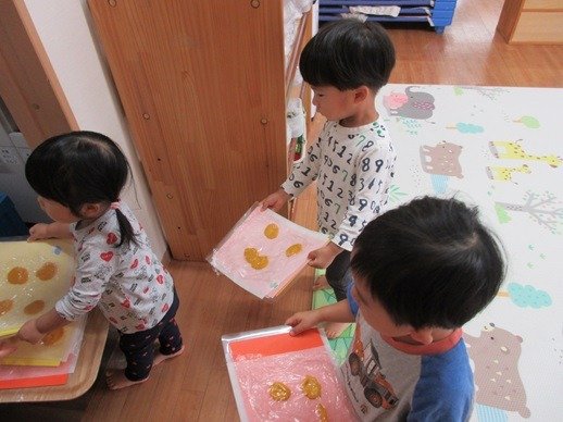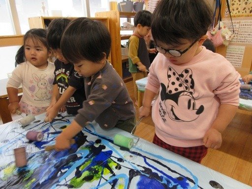 うさぎ・ひよこ組さんは、絵の具を置いた紙の上にビニールをのせて、ローラーで絵の具を広げます。コロコロしているうちに色が混ざり合って何とも言えない模様になって、絵本”ねこのピート”の世界に入り込んだみたい。